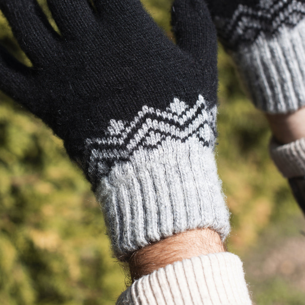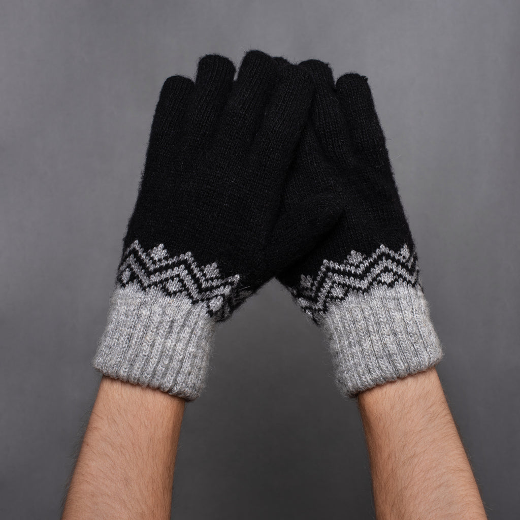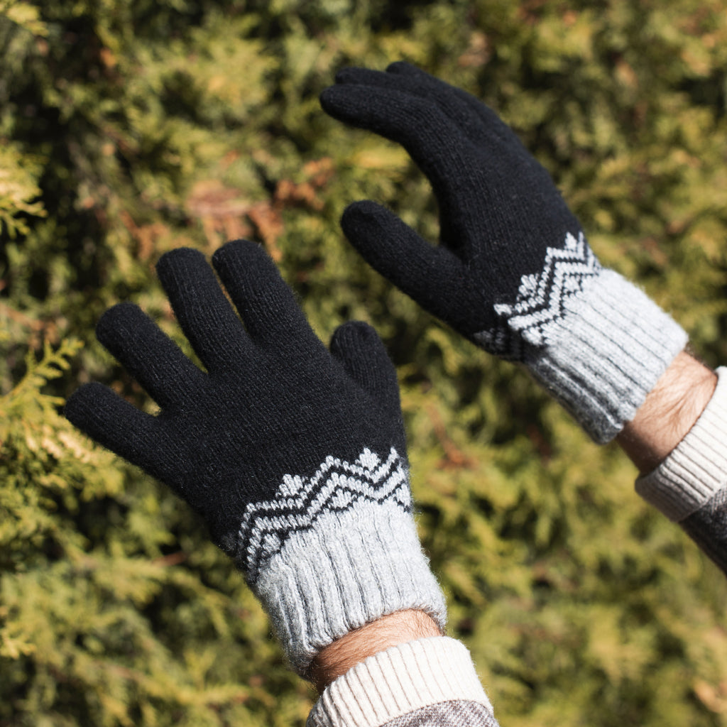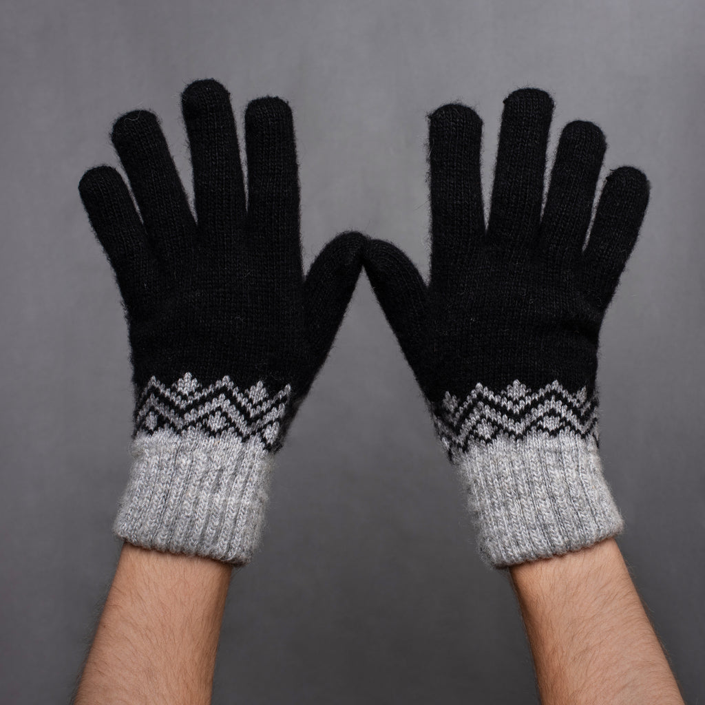 Modern warmth with timeless detail. These gloves feature a clean black body with a striking gray cuff and a geometric banded pattern—offering a bold yet classic winter look. Made from thick, breathable goat wool, they insulate naturally without overheating. Ideal for daily wear, outdoor errands, or gifting with style. Each pair is hand-loomed by women artisans using traditional techniques.
