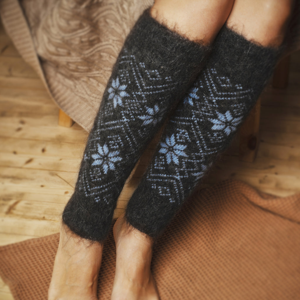 Introducing our "Blizzard Breeze" goat wool leg warmers, the perfect companion for chilly days. These leg and ankle warmers will embrace you with their traditional pattern while providing a pop of color with their delicate blue snowflakes. Crafted by hand on a loom, they offer exceptional insulation and a cozy feel, making them ideal for all your winter escapades.