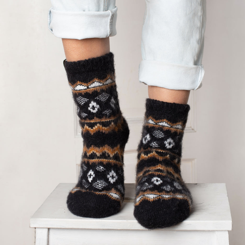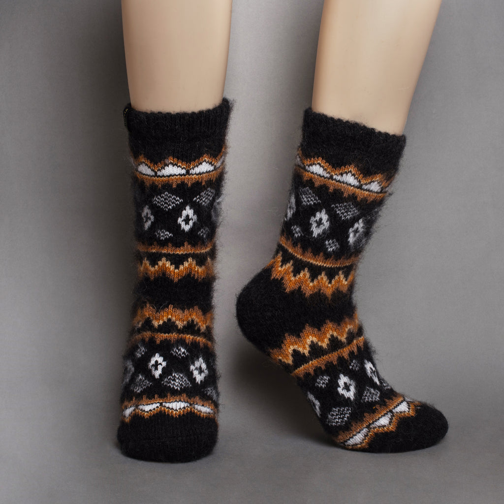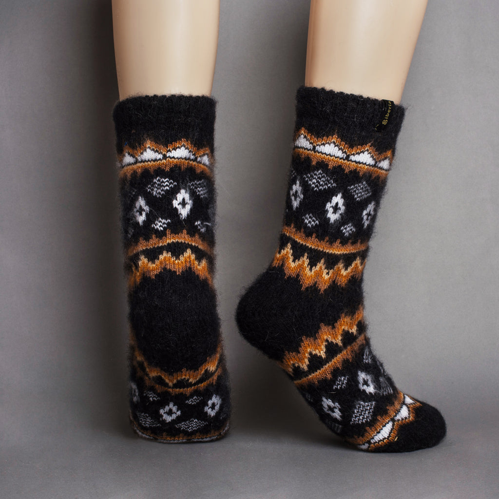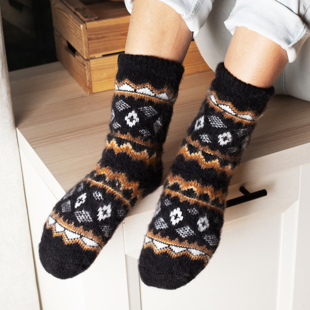 These exceptionally thick socks will bring your cold feet the ultimate warmth and comfort on a cold night or day. This design features a sleek black base adorned with a Southwestern-inspired pattern in rich brown and crisp white. Combining bold design with cozy warmth, they add a touch of rustic sophistication to any outfit.
