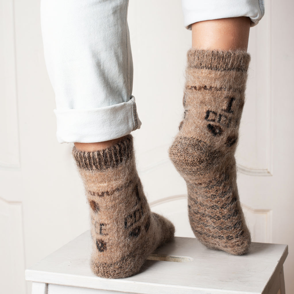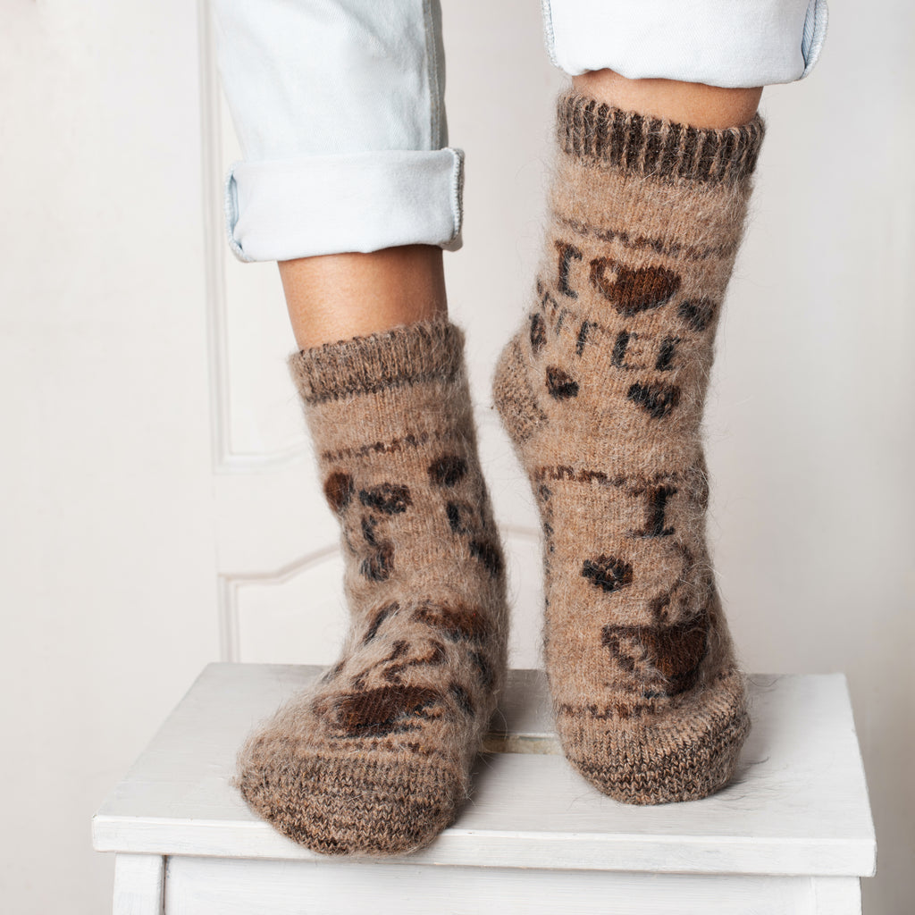 Our crew-length goat wool socks will become your go-to choice for comfort, whether you're looking for hiking, lounging, or sleeping socks. This set features a steaming cup of coffee on a rich latte-colored background, catering to the inner coffee-lover in you. Elevate your daily routines or outdoor adventures with the ideal choice for those who prioritize both comfort and style in their everyday wear.