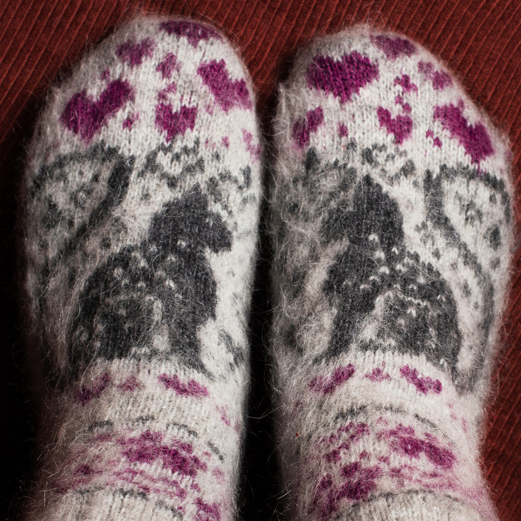 Cuteness you can cuddle up with! These socks showcase two adorable cats sharing a heart, set against a soft gray background that makes them feel as cuddly as a kitten. Made with soft, natural goat wool, they’re breathable, plush, and ideal for lounging, gifting, or snuggling with your own furry friend. Each pair is a small batch creation from our family-run business, where care and tradition shape every stitch.