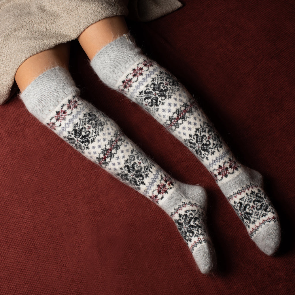 Our Winter Wonderland tall socks are designed in the traditional Fair Isle style. The symmetry of the patterns and their attractive color combination make these socks a striking, yet versatile piece of your wardrobe. These classic-patterned socks will make you feel very cozy and warm, whether you are skiing, outing with your girlfriends, or relaxing at home.