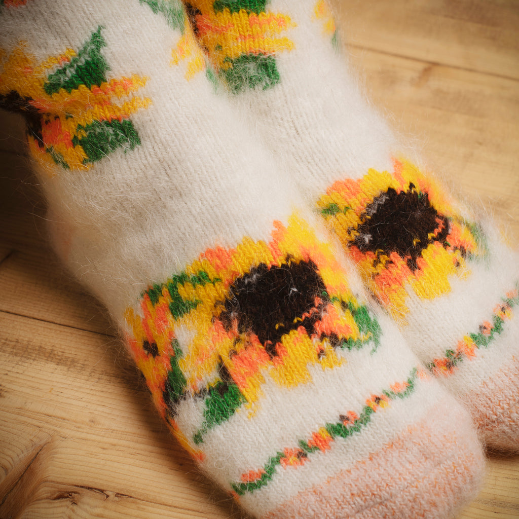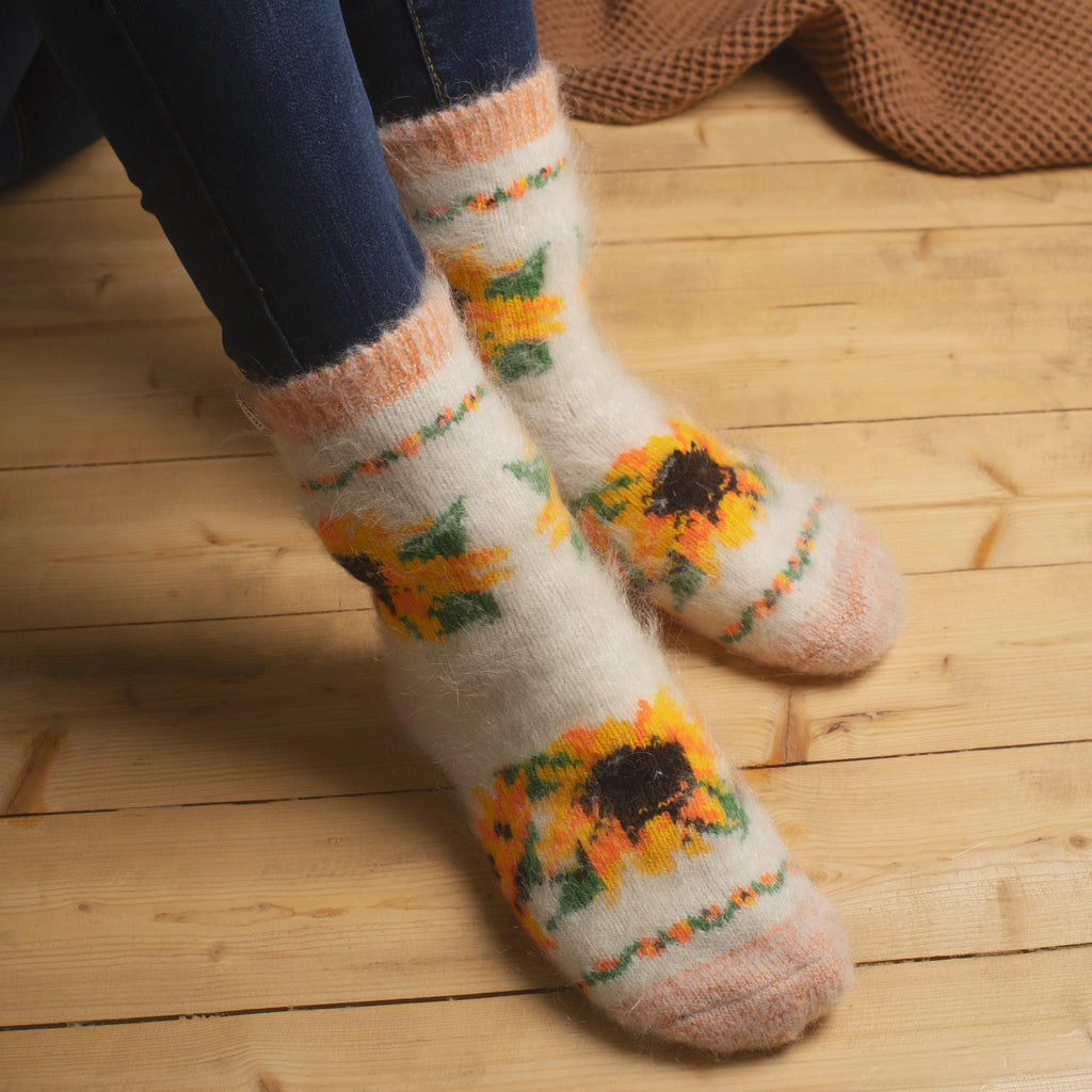 A ray of sunshine for gloomy days. These cheerful crew socks with a vibrant yellow sunflower will bring warmth and light to your winter wardrobe. Made from breathable goat wool and finished with a soft, flexible cuff, they’re perfect bed socks or house socks. Made by women in Eastern Europe - where every stitch tells a story of care and comfort.