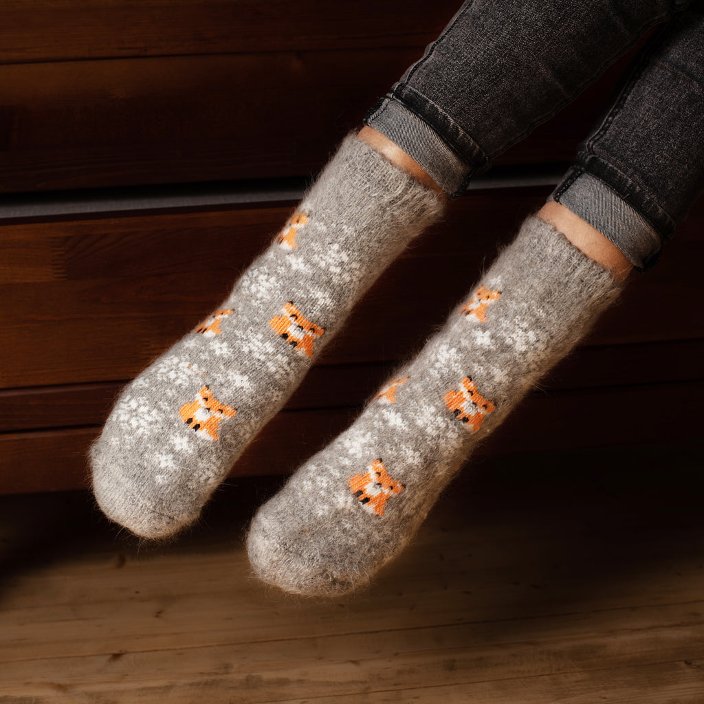 To help you stay warm and cozy on a cold night, you'll want to cuddle with our cute foxes. With their pointy ears and fluffy tail wrapped around their little paws, our Frisky Foxes will snuggle your feet and keep you toasty. A light dusting of powdery snowflakes surrounding the foxes completes the design, creating an adorable pair of thick wool socks.