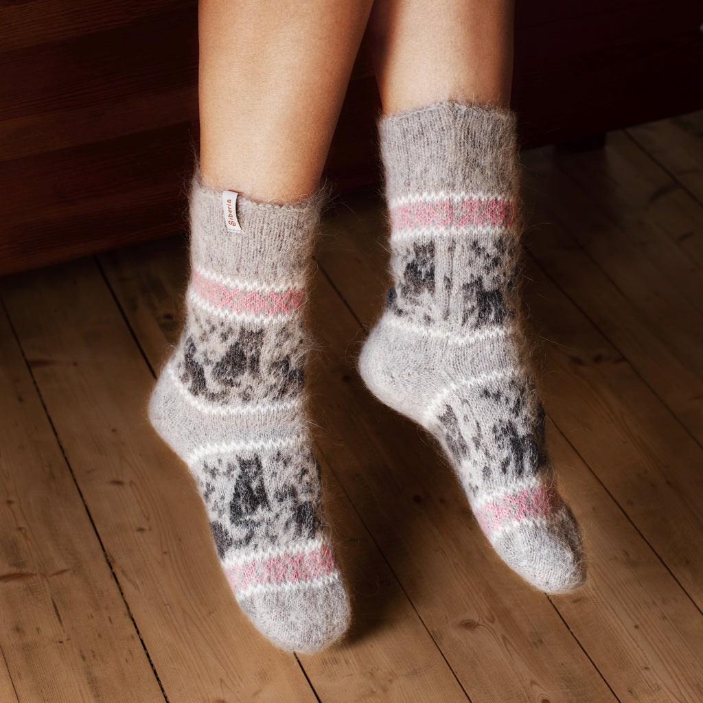Your new favorite purr of socks. These crew socks feature two cozy cats curled into a heart, loomed into soft, goat wool warmth. Their flexible, non-binding cuff adds comfort, making them perfect as boot socks or slipper socks. Hand-loomed with natural fibers by women artisans - each pair is a tribute to warmth, whimsy, and handmade tradition.